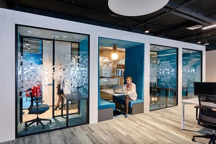 設(shè)計(jì)團(tuán)隊(duì)基于此而創(chuàng)建了多元工作模式,包括傳統(tǒng)的工作站、臨時(shí)會(huì)議區(qū)、舒緩休閑區(qū)、小空間、以及個(gè)人專注工作室。此外還設(shè)有大型看臺(tái)式階梯座和社交咖啡\餐飲區(qū),這兩處區(qū)域彼此相鄰,可以用作公司大型集會(huì)、演講和派對(duì)活動(dòng)等。