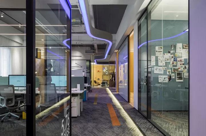 變換色彩的天花燈帶將開放工作站、私密工作站和站立會議室連接,看似互相連通卻又相互獨(dú)立,滿足在有限空間中實(shí)現(xiàn)功能復(fù)合的概念,增加整個空間的靈活性。工作站作為員工的重要工作區(qū)域,辦公桌配置智能升降功能,讓員工在坐式辦公和站式辦公隨意切換,減少工作帶來的疲勞。