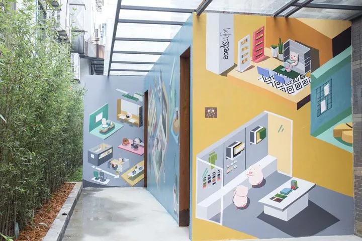 對于戶外,追求“少即是多”的理念,簡約時(shí)尚的休閑椅、茶幾和企業(yè)形象Pig點(diǎn)綴其中,摒棄了繁雜的裝飾,使整個氛圍變得輕松、愉快,而洗手間區(qū)域通過涂鴉將企業(yè)創(chuàng)意的想法表達(dá),增加空間的藝術(shù)色彩。