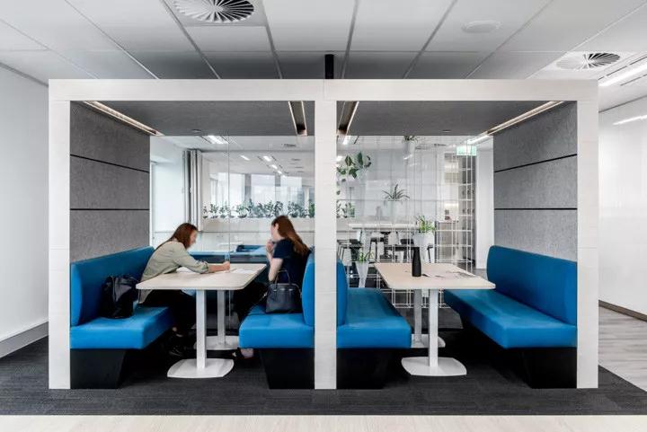 咖啡吧以戰略性的布局介于董事會議室和協作區之間,移動門和百葉窗使其能夠打開形成大型娛樂和聚會空間。或者,圍合起來形成小型團隊培訓班和講習班。工作區一旁是一排寧靜的“船艙”,讓人聯想起甲板上的布局。每個小木屋的門外都有一個指示燈,顯示房間是否正在被占用,,人們就能快速找到空房間來打私人電話。