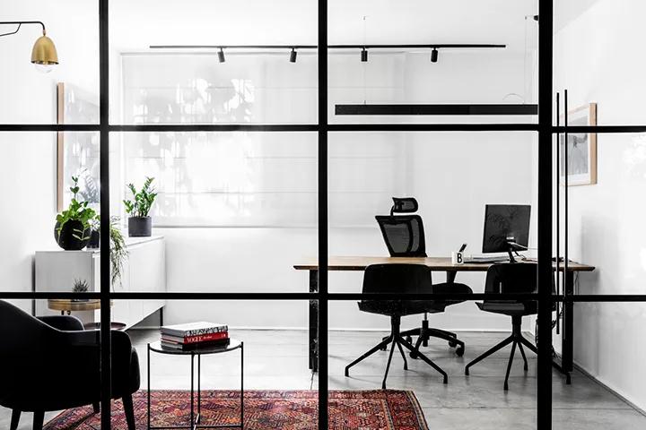 內(nèi)部采用極細(xì)的黑色金屬框架玻璃作為新的隔斷墻,與大面積的白墻形成鮮明而有趣的對(duì)比。辦公區(qū)設(shè)計(jì)和休閑區(qū)使用天然水泥地板,會(huì)議室由魚骨木地板制成。定制鋼架辦公家具和精心挑選的家庭休閑家具設(shè)計(jì)交織在一起,營造出統(tǒng)一的環(huán)境氛圍。