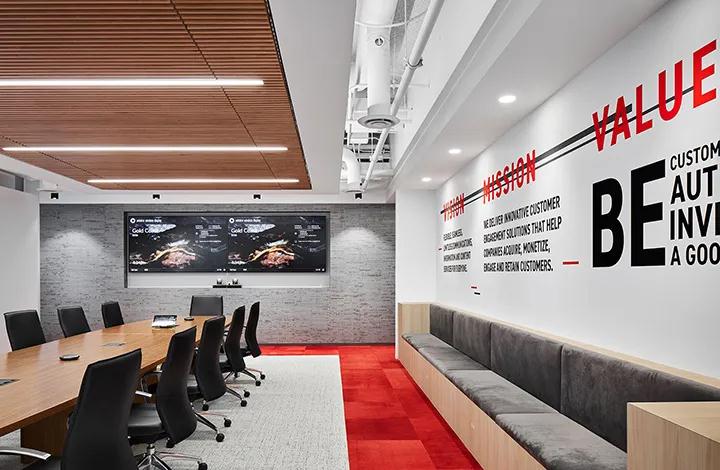 深圳裝飾公司的設(shè)計團(tuán)隊在簡單的走廊和繁忙的會議廳設(shè)計鼓舞人心的文字標(biāo)語和圖形設(shè)計;裝飾在明亮,開放的頂表面上的吸音板來自徽標(biāo)的幾何結(jié)構(gòu)。紅色還用于裝飾開放式辦公室區(qū)域的門,家具和天花板。